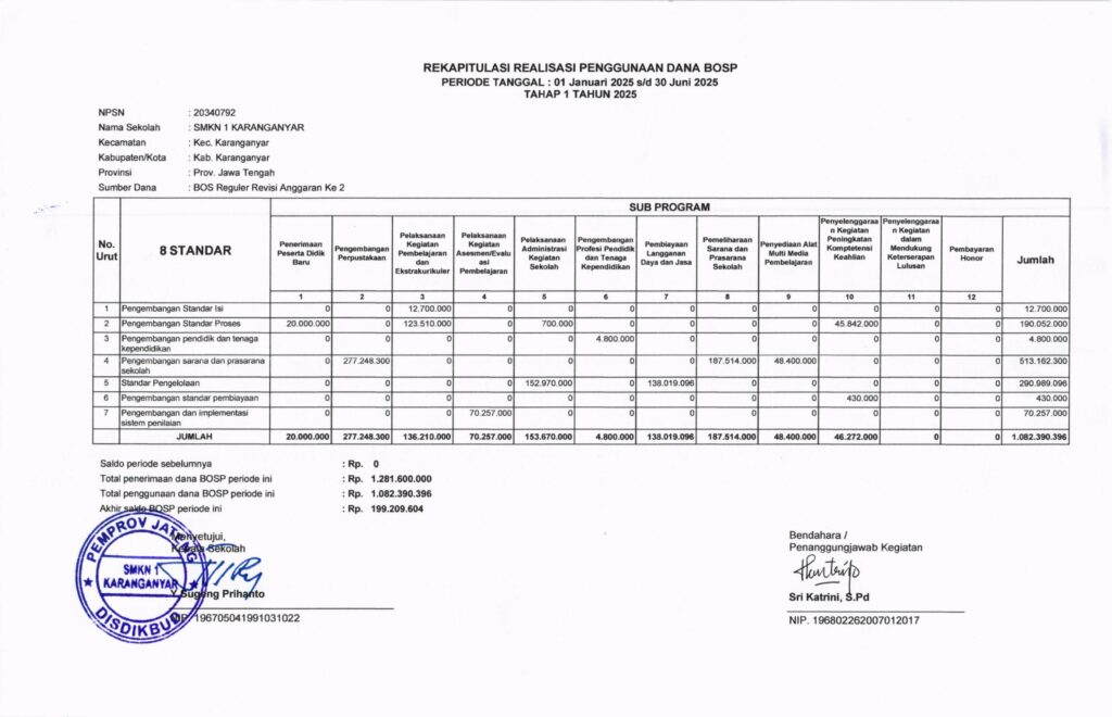 • Laporan Rekapitulasi Realisasi Penggunaan Dana BOS regular Tahap 1 tahun 2025